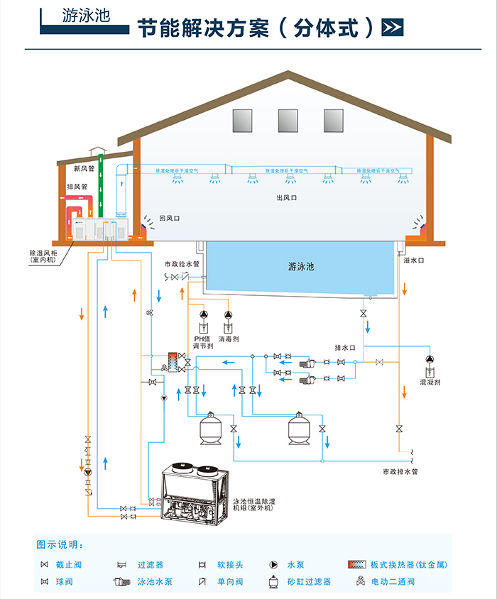 3. 配合除濕風柜,通過吸收室內泳池空氣中的熱量實現室內泳池環境除濕。