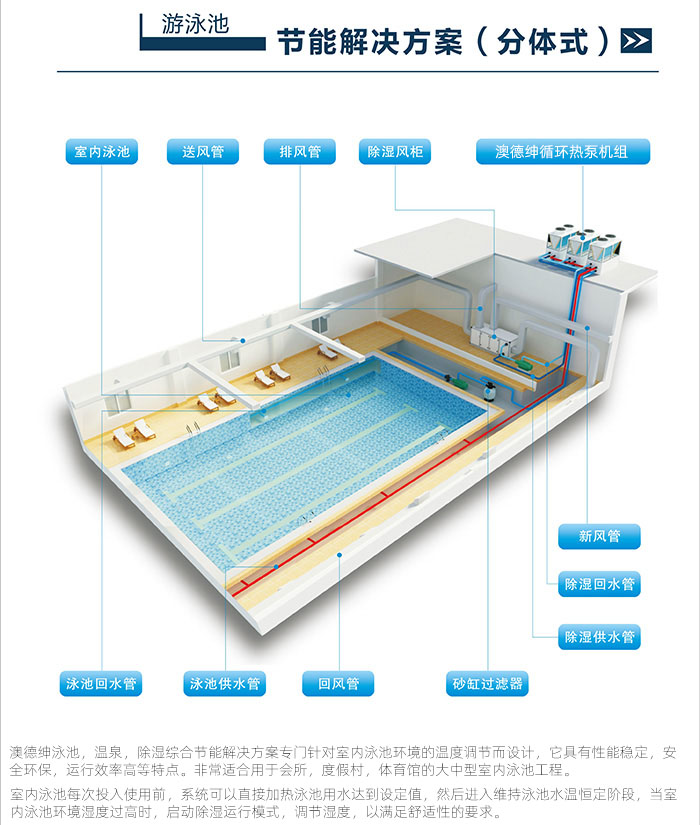 ? ? ? ? 澳德紳泳池,溫泉,除濕綜合節能解決方案專門針對室內泳池環境的溫度調節而設計,它具有性能穩定,安全環保,運行效率高等特點。非常適合用于會所,度假村,體育館的大中型室內泳池工程。